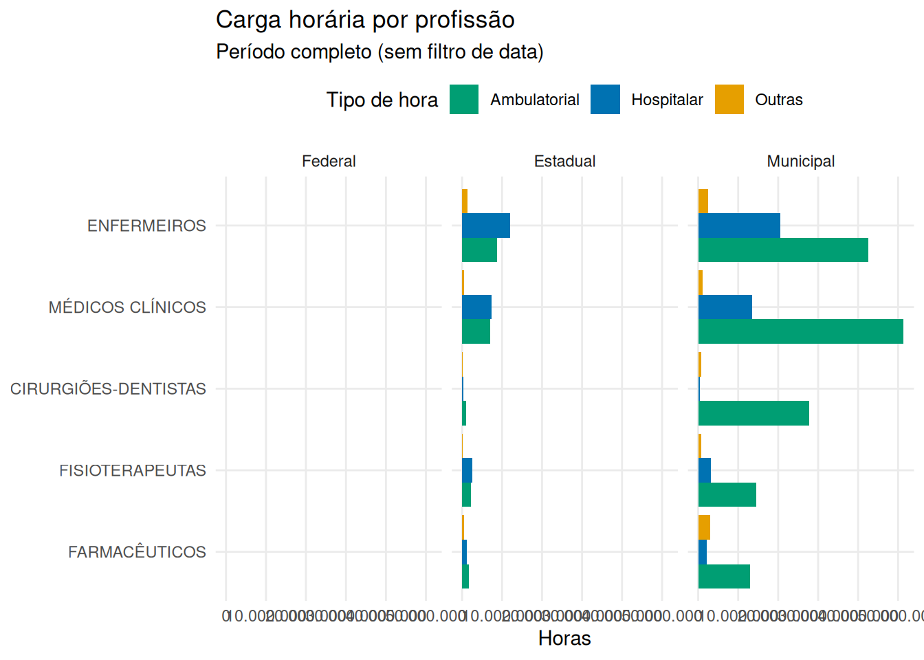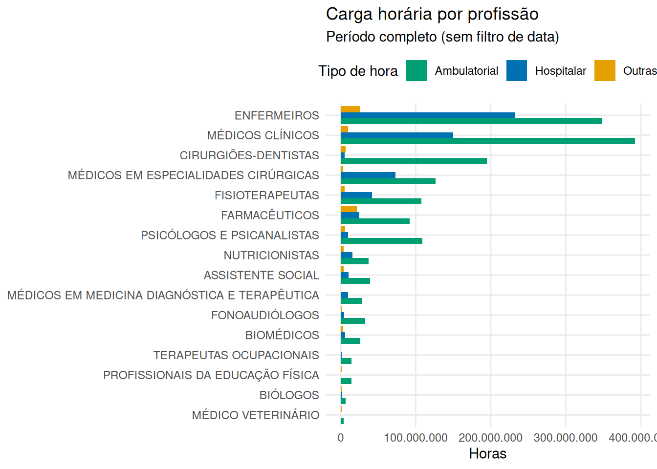 É possível que alguns dados do final de 2025 ainda não tenham sido atualizados. Excluindo as informações de profissionais que não sejam da saúde, a situação nesse período é, em número de horas, o mostrado no gráfico a seguir. Enfermeiros, médicos clínicos e odontólogos são os 3 que mais trabalharam no período.