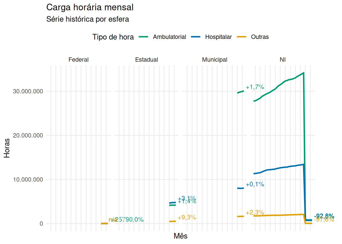 Esses números mostram que os municípios são responsáveis pelo maior número de profissionais que atendem a rede pública. As evoluções ao longo do tempo de profissionais de saúde estaduais e municipais: